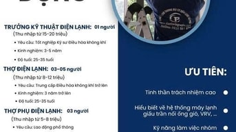 TUYỂN NHÂN VIÊN KỸ THUẬT ĐIỆN LẠNH TẠI KHU VỰC TÂN PHÚ