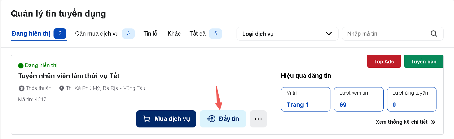 Để thực hiện Đẩy tin, bạn vui lòng Đăng nhập vào tài khoản > nhấp vào mục “Quản lý tin tuyển dụng” và thực hiện theo các bước sau: