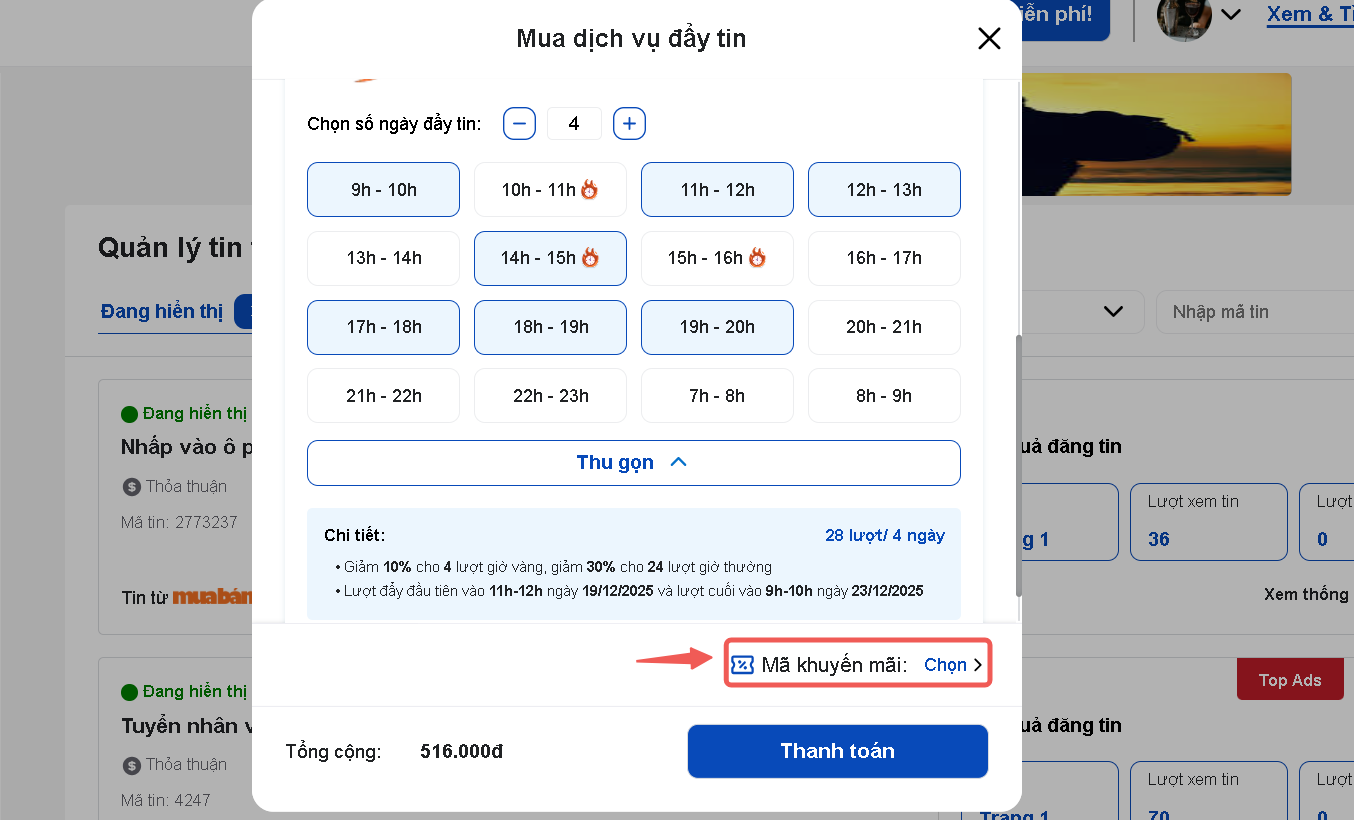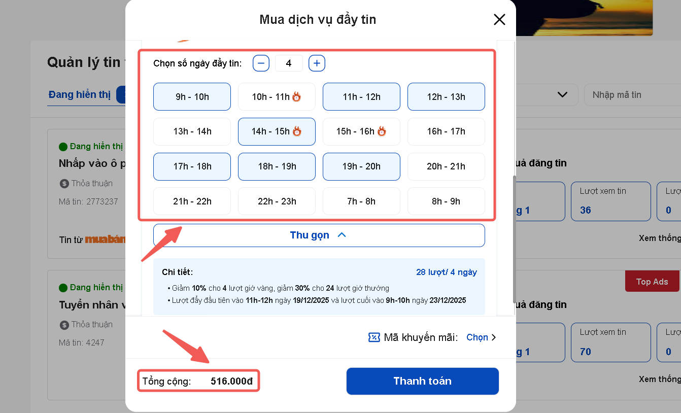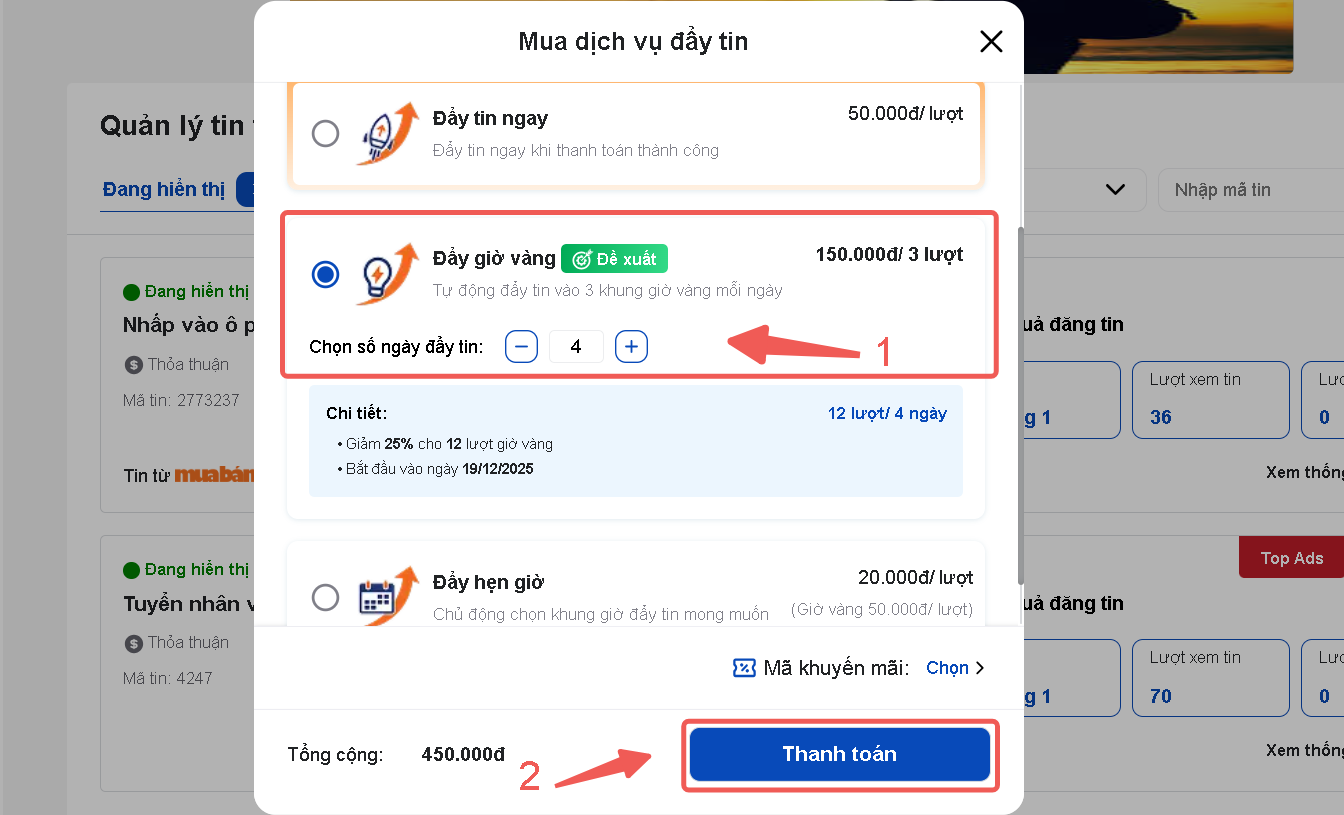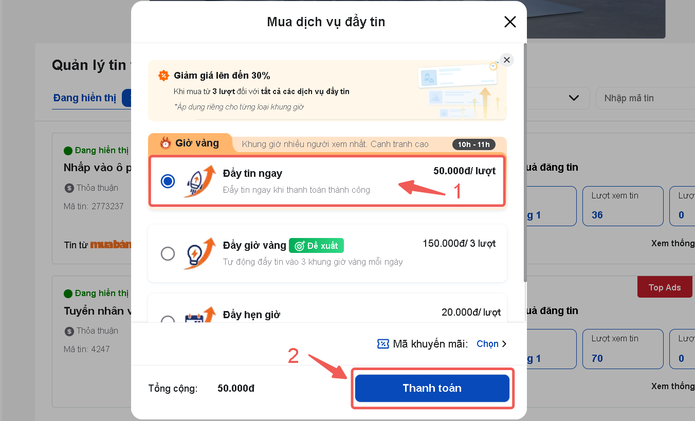 Cách này sẽ áp dụng ngay lập tức khi bạn click Đẩy tin ngay và Thanh toán