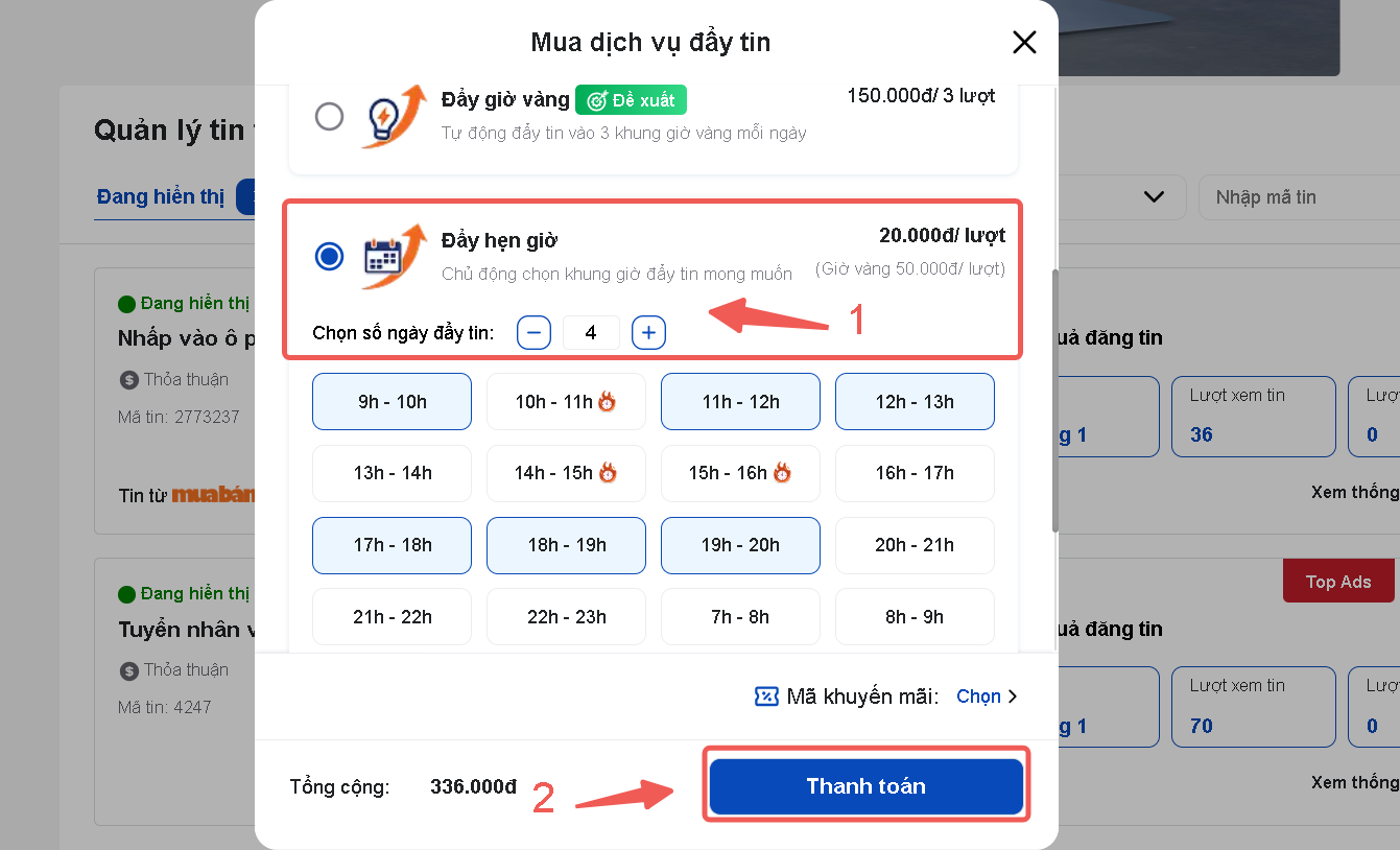 Khi mua gói đẩy hẹn giờ, hệ thống sẽ đẩy tin theo khung giờ mà bạn chọn. Bạn có thể chọn nhiều khung giờ và chọn đẩy tin trong nhiều ngày