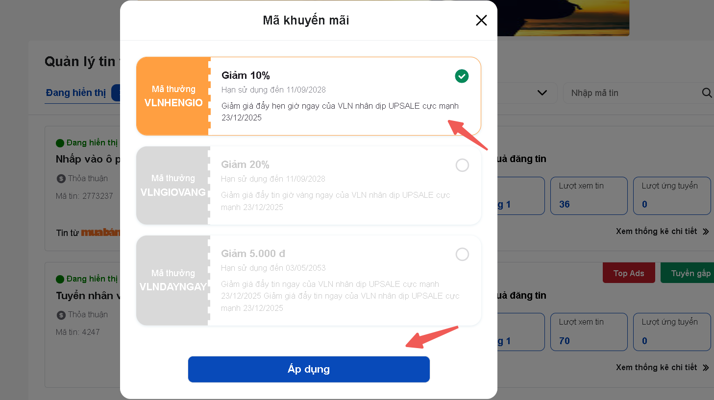 Sau khi mua dịch vụ, bạn chọn Mã khuyến mãi