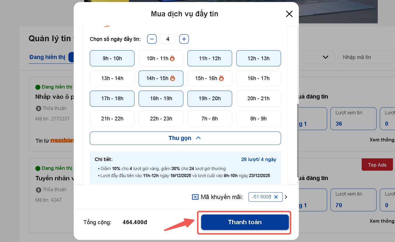 Chọn Thanh toán để hoàn tất quá trình mua dịch vụ đẩy tin