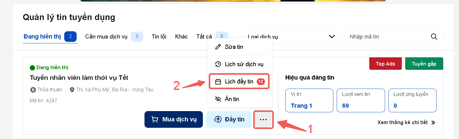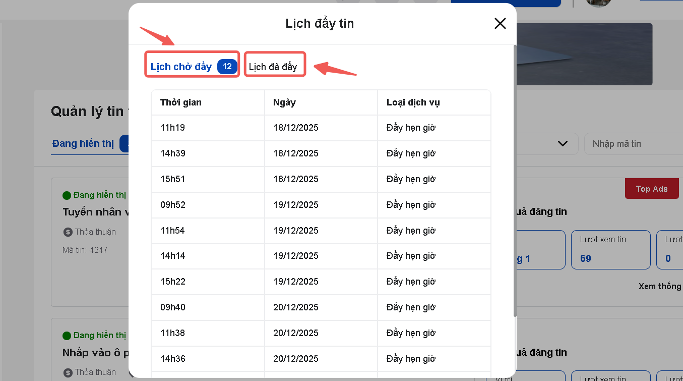 Sau khi thực hiện mua Dịch vụ đẩy tin, bạn có thể vào kiểm tra lại lịch đẩy tin đã chọn bằng cách:
