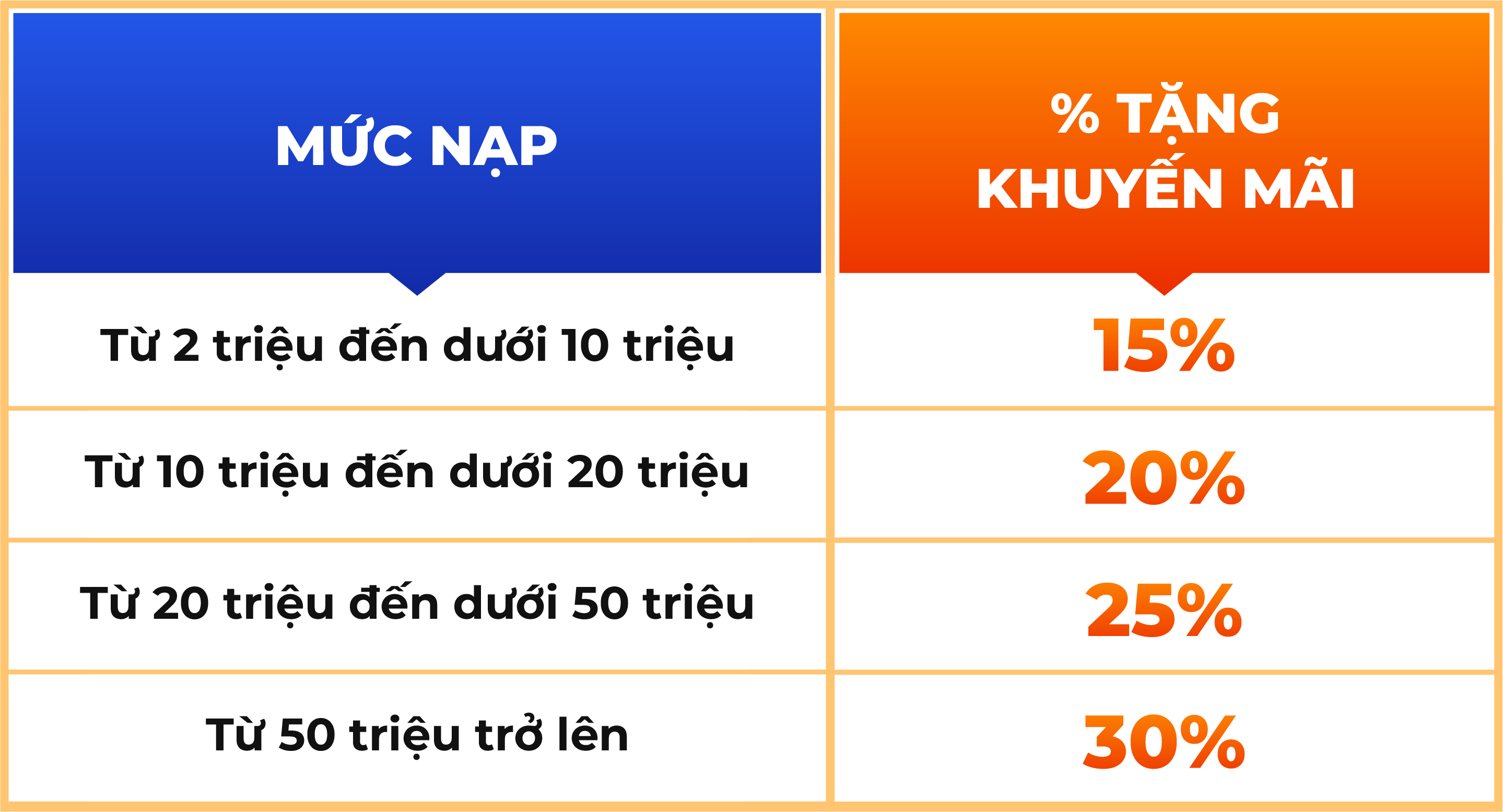 NHẬN NGAY TỚI 30% KHI NẠP TIỀN TỪ 2 TRIỆU